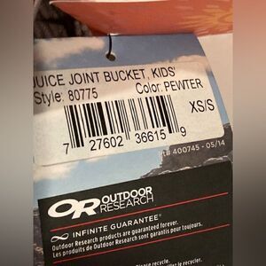 NEW youth bucket cap, hat from the brand Outdoor Research. This is the ‘juice joint’ line of bucket hats with style code 80775. Color is called ‘pewter’ which resembles gray to my eyes. It’s for youth 0-3 years old or XS/S. Inner circumference is around 18”. Really nice sun protection and wide brim, so you get up to 50 SPF+ protection. 80% organic cotton and 20% recycled polyester. Free shipping. Thanks for looking