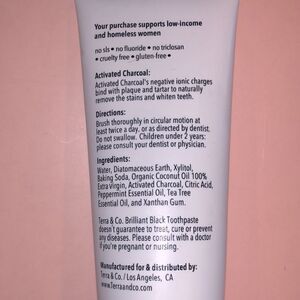 Our natural, teeth whitening Brilliant Organic Charcoal Toothpaste contains high-quality, activated charcoal, which works to help brighten your pearly whites. Tubes made out of SUGAR CANE. Ingredients Activated Carbon:anti-bacterial, anti-fungal, negative ionic charges of charcoal bind to bacteria, plaque, and tartar to remove stains and promote healthy pH levels in the mouth. Baking Soda:Naturally whitens and polishes teeth. It helps to fight plaque which causes acid and dry mouth
