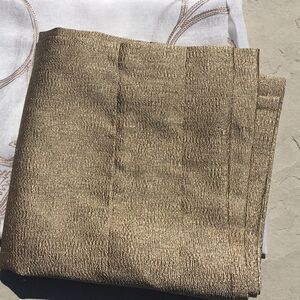 Amazing sheer curtain panel with very pale bronze gold embroidery. It’s new without tags and also comes with gold valance and tie back.