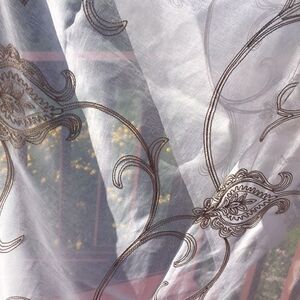 Amazing sheer curtain panel with very pale bronze gold embroidery. It’s new without tags and also comes with gold valance and tie back.