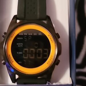 Stand out with our latest George fashion sport digital watch. The vibrant orange inner bezel creates a striking contrast with the negative digital readout, delivering the ultimate impact in design. This timepiece features a soft-touch silicone band for comfort and a gunmetal-tone plated case for a sleek look. With these key features, it fulfills all the must-haves, making it a stylish and functional accessory for those who seek a bold and contemporary statement in their wristwear collection.