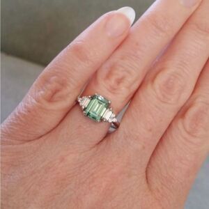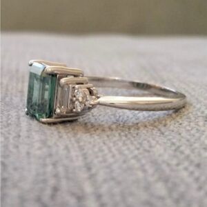 💚 Stunning antique emerald colored stone emerald cut setting with crystal facets adorning each side. Super pretty and super sparkly with a brushed silver finish. Color of stone appears lighter, it’s emerald green size 7 💚