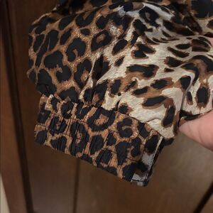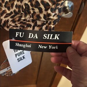 NEW with Tags FuDa 100% Silk Leopard Print Bomber Jacket; Zip Front - Size Large. Measures approximately: Length 26.5”; sleeves 24”; armpit to armpit 25.5”