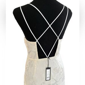 New with tags Romeo & Juliet Couture ivory cross back velvet print dress size Small. Slip style, lined, burn out velvet with gold threads in thin stripes. Back strap details, spaghetti straps. Very fancy!!