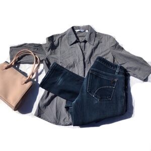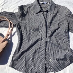 Button down. Tight, small gingham / checkered pattern. Short sleeve / 3/4 sleeve length. Collared.