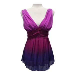 Turn heads in this stunning NEXT ombré babydoll tunic top, featuring a rich pink-to-purple gradient that flows effortlessly from the bodice to the hem. The empire waist and pleated chiffon overlay create a romantic, flattering silhouette, while the deep V-neckline and cross-ruched bodice add a touch of feminine sophistication. Perfect for a date night, vacation dinner, or paired with jeans for a flirty daytime look, this top transitions beautifully from casual to dressy.