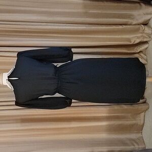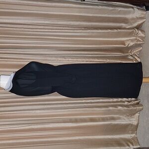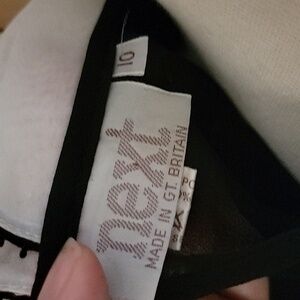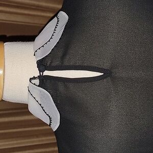 Next made in Great Britain black Chiffon dress. Size 10 , but appears to run small. Chest measures approximately 17" across . The elastic waist measures 12 " flat and stretches to 15 ". Waist to hem measures 28". Sheer pleated top with Peter Pan collar and 3/4 sleeves. The skirt is pleated as well. There are belt loops , but no belt is attached