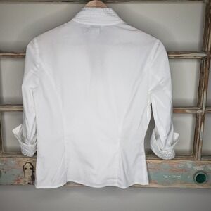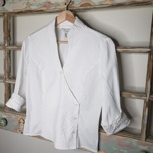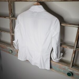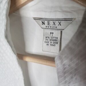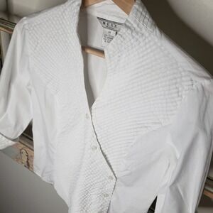 Nexx White button up top with tuxedo pleating in ladies size small. This top has fold up sleeves and V-neckline. In pristine condition. Measures 16.5" pit to pit and 21" in length.