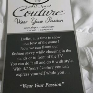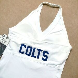 This elegant V-neck halter top by NFL All Sport Couture is a perfect choice for any fashion-forward woman. The white top features the Indianapolis Colts logo, making it an ideal pick for sports enthusiasts. It comes in size Large. Bust is approx 36 inches. Length is approx 24 inches. Features a built-in bra shelf with removable padding. The halter strap gives it a stylish look, making it an appropriate choice for any casual or formal occasion. The top is made of high-quality stretch fabric and is brand new with tags. It is perfect for those who love to flaunt their love for sports and couture.