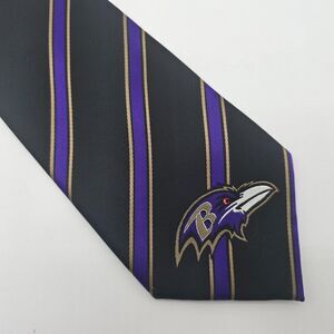 Officially licensed NFL Baltimore Ravens tie featuring the team’s embroidered logo on a classic black base with purple and gold diagonal stripes. Constructed from durable polyester with a smooth satin finish, this tie is ideal for game-day events, office wear, or team-spirited formal occasions. A must-have for any Ravens fan or collector. Ties are rolled and placed in plastic bags and shipped in bubble mailers for protection. Wrinkles may form in shipping, and ironing may be required upon receipt.