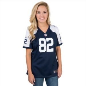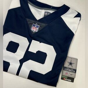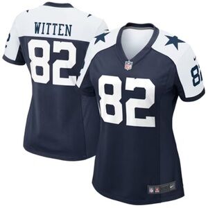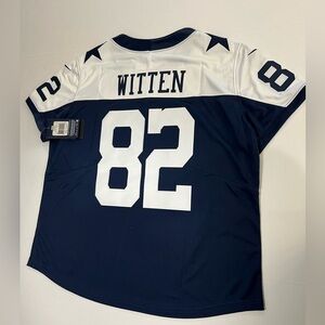 This NFL jersey boasts a vibrant blue and white color palette with a boxy, fitted silhouette. The short sleeves and V-neck design offer a stylish and comfortable fit. Featuring the number '82' and 'WITTEN' on the back, it's a must-have for any fan.