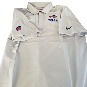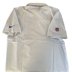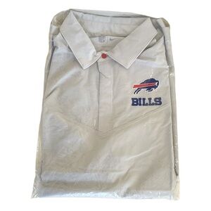 NFL Buffalo Bills Dri-Fit Nike Football On Field Apparel Snap Button Up Short Sleeve Shirt. Shirt size men’s Large. *Thin shirt, see through. *See photos. Some stretch to shirt. Polyester and spandex. Light gray color with sewn raised team logo. Brand new with tags and shirt in plastic. Purchased from NFL pro shop. Retails for $80.
