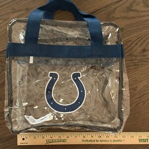 Transparent tote with blue handles. Features Colts NFL logo