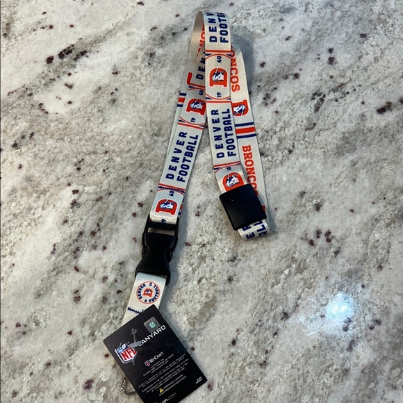Official NFL lanyard featuring Denver Broncos logo. White and blue design with bold team graphics.