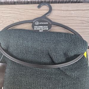 Show your support for the Green Bay Packers with this colorblock scarf and glove gift set. The set includes one scarf and two gloves, all featuring the team's colors and logo. Perfect for staying warm and stylish during football season or as a gift for a fellow Packers fan. The brand, Little Earth Productions, is known for their high-quality sports merchandise. This set is new with tags and comes in a custom bundle.