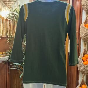 Throw it back to game day glory with this vintage-style Green Bay Packers tee, perfect for repping Wisconsin pride all season long. Featuring bold gold and white varsity stripes and a soft retro-green base, this comfy top brings 90s collegiate energy with a flattering women’s fit and 3/4 sleeves. Whether you're headed to Lambeau or watching from the couch, this top keeps you cute and cozy in true fan fashion. Style it with denim shorts or layer under flannels for a laid-back Sunday-ready look.