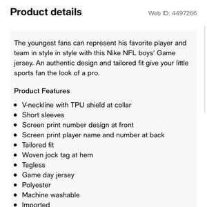 The youngest fans can represent his favorite player and team in style in style with this Nike NFL boys' Game jersey. An authentic design and tailored fit give your little sports fan the look of a pro.