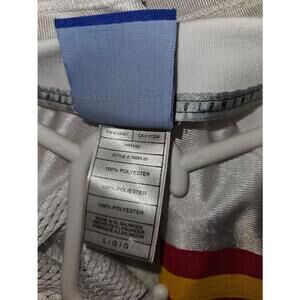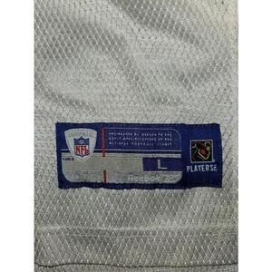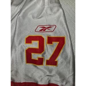 This is a men's Reebok NFL jersey in size L. It is white with red and yellow accents. The jersey has the number 27 on the front and back. It is made of 100% polyester and is in good preowned condition.
