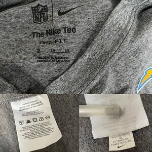 NFL Los Angeles Chargers Football Team Apparel The Nike Tee Dri-Fit Long Sleeve Shirt. Men’s size XL. New without tags. 100% polyester. Dark gray color. Small mark on NFL logo on sleeve (see close up). Soft fabric for comfort and a relaxed fit, making it ideal for everyday wear. Lightweight and see through. Crew neck design and small NFL team logo on the chest. See all photos.