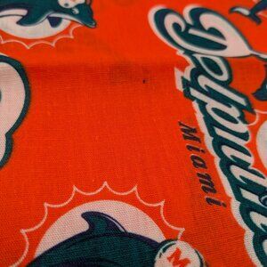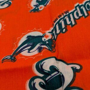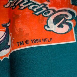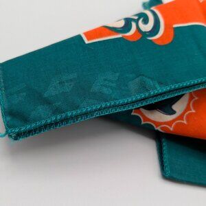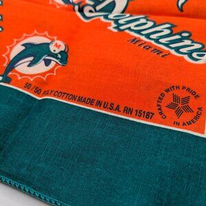 NFL Miami Dolphins 1999 bandana handkerchief, vintage and pre-owned but in new unused condition. Made in the USA from a 50/50 cotton/poly blend, featuring team graphics from 1999 with some manufacturing imperfections, marks, loose threads shown in the images. Stiff, new, unwashed feel. Ideal for fans or collectors. Measures approximately 21"x21".