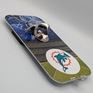 NFL Miami Dolphins Magnetic Clink 'n Drink bottle opener, measures 5" x 10", features rubber-coated magnets that catch falling bottle caps and allow attachment to any magnetic surface. Pre-owned in excellent condition; box shows wear as shown in photos.