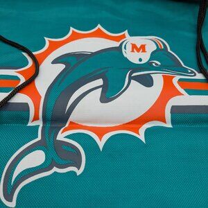 Miami Dolphins drawstring bag in team colors with official team logo and black drawstring closure. Measures approximately 17" x 13". Pre-owned with clean, unused interior; blemish on back as shown in photo. Great for everyday use, game day, or a fan collection.