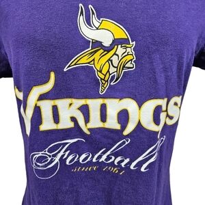 Features NFL Team Apparel purple Minnesota Vikings short sleeve t-shirt, scoop neck, Vikings logo across chest, Vikings Football in script across torso, falls at hips, cheer on your favorite team on game day.