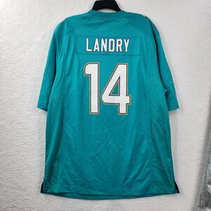 The product is an NFL Nike men's XL Miami Dolphins Jarvis Landry #14 jersey. This unisex adult jersey is in the team's signature blue color and features the player's name and number. It is designed for the regular season and is an official licensed product by Nike. Perfect for showing support for the Miami Dolphins and player Jarvis Landry during game days or casual wear.