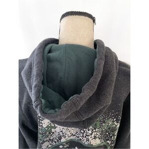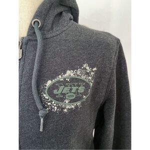 Cozy charcoal Jets hoodie with a cool paint-splatter logo on the back and small logo hit on the front. Full zip closure, kangaroo pockets, ribbed cuffs and hem, and a soft green-lined hood. Finished with an NFL logo zipper pull. Super comfy for game day, lounging, or casual streetwear fits.