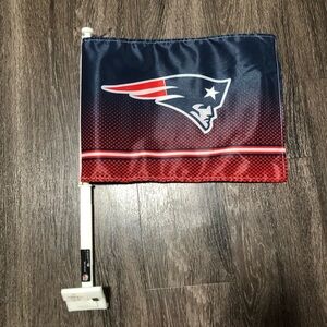 Show your team pride on the go with this official NFL New England Patriots car window flag. This is a brand new item, still in its original packaging with the tags attached. The flag features the classic Patriots logo on a blue and red background with a cool dotted graphic fade. It's designed to attach easily to your car window, so you can show your support on game day or every day. This is an official NFL novelty item from Rico Industries. It's the perfect accessory for any Patriots fan and a great way to get noticed while driving.