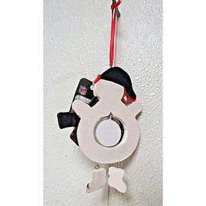Your team spirit with this adorable Clay Dough Snowman Christmas tree ornament! Your team logo dangling in center belly, wearing stripped hat with matching scarf holding a candy cane. 4 3/4" tall, 3 3/4" wide and 1" deep. Over all height including ornament and ribbon 7 1/2". Licensed by the NFL to Team Sports America.