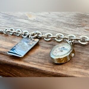 The 7.5” inch charm bracelet is fully adjustable and includes a 1.25” inch extender. The watch face is 22mm. The tag is slightly over an inch long.