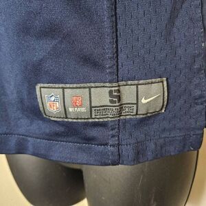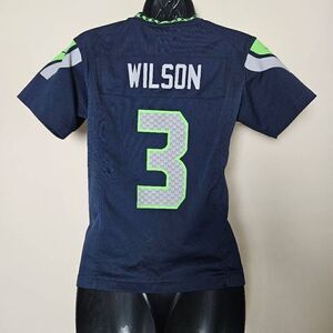 This is a short sleeved Seattle Seahawks Russell Wilson jersey by NFL. It is navy, grey, silver, and green.