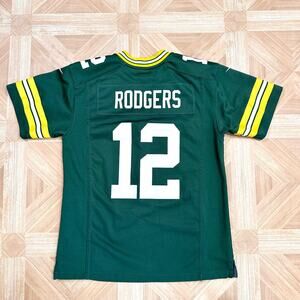 This NFL On Field Aaron Rodgers #12 Green Bay Packers Football Jersey, Youth Size M, features the iconic team colors and player's number. Ideal for young fans, it offers a sporty look and comfortable fit for cheering on the Packers.
