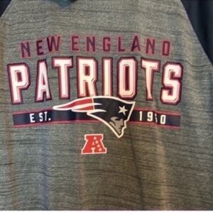 Show your team spirit with this NFL Patriots sweatshirt, featuring a stylish gray and black design. Perfect for casual wear, this hoodie combines comfort and style for any fan. The bold 'PATRIOTS' text and logo on the front make it a standout piece for game days or everyday wear.