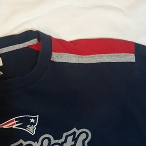 This is a NFL Jersey with Patriots on front. Made of 100% cotton. Navy body and long sleeves has Patriots written In grey with the logo above in red white n blue. And NGL underneath. The tops of shoulders in red with grey stripe. Size large. Measurements are approximately pit to pit 23" top to bottom 29". In excellent condition.!! Nothing wrong. ๐๐ฏ๐๐ฏ