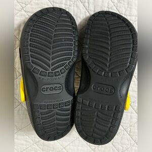 These are NFL Pittsburg Steelers Crocs in a size Women's 6-7 (M 4/5) in Black & Gold color. The style is a slide-on design made of rubber material, suitable for both men and women. The Crocs come with Jibbitz accessories and feature the NFL Pittsburg Steelers as the character family theme. These Crocs are new without tags.