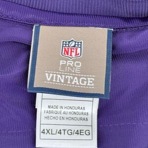 Show your Minnesota Vikings pride with this NFL Pro Line Vintage Jersey, size 4XL. Featuring the iconic Viking head logo on both sleeves, bold purple mesh fabric, and classic yellow/white sleeve stripes, this jersey blends retro style with breathable comfort. The NFL VINTAGE patch near the hem and NFL shield at the collar add authentic detail, making it perfect for fans and collectors alike.