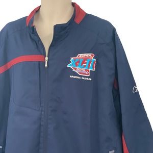 This is a very nice Men's NFL Reebok Super Bowl XLII Arizona 02/03/08 Giants/Patriots Zip Front Windbreaker Jacket in navy/red in a Size 2XL, made in Vietnam. (MC-I15)