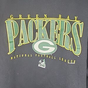 The NFL (Riddell) Green Bay Packers Big Logo Black Crew Neck Sweatshirt from the 1990's in size XL features the iconic team logo prominently displayed on the front. This officially licensed piece of fan apparel is perfect for showing support for the Green Bay Packers during the regular football season. The sweatshirt is designed with a classic crew neck style and is ideal for any fan looking to stay warm and stylish while cheering on their favorite NFL team.