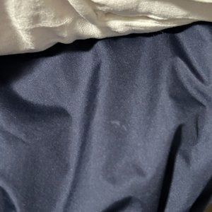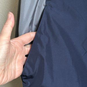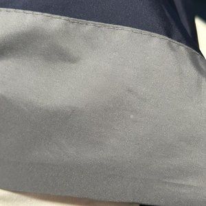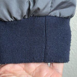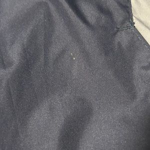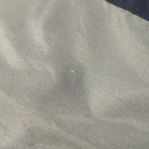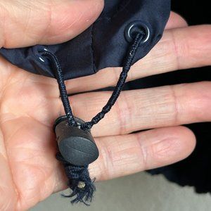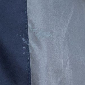 Good pre-owned condition. Spot on one sleeve, appears like light colored paint. Few tiny spots on sleeve, on the back, on the front (only few and tiny, possibly whitish paint - maybe will come off with treatment). The drawstring is there but shows signs of aging and being stretched out a lot (pretty much no elasticity to it anymore). Minor wear on the sleeve cuffs. See photos.