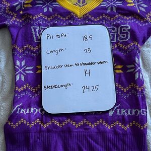 Minnesota Vikings Ugly Christmas Sweater by NFL Shop in Purple, Gold and Grey. V-neck. Long sleeves. RIbbed trim. Power box attached inside sweater. Gently worn with no visible flaws. Worn once. Measurements in photos.