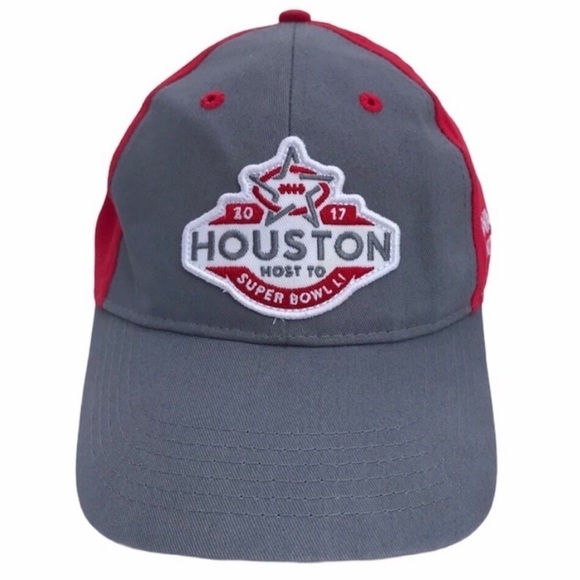 F7 Hat/Cap Houston 2017 Superbowl LI Superbowl logo patch in greyredwhite/2tone grey front panels and red rear panels with grey accents. Adult Adjustable Strap with Buckle Superbowl Houston Volunteer Cap/Grey Red Super Bowl