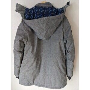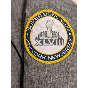 NFL Super Bowl XLVIII hooded parka jacket with patches and pockets. Full zip closure and inside pockets. Gray. Size Large. Made in China.