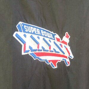 Vintage black polyester windbreaker jacket commemorating Super Bowl XXXVI, held February 3, 2002, in New Orleans. Features the official Super Bowl 36 patch at left chest and Clear Channel Entertainment embroidery on the right sleeve—marking the media giant’s role in event production during the early 2000s.