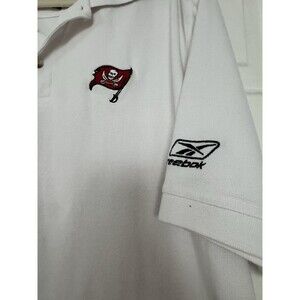 The product is a men's Reebok polo shirt in size M, featuring the colors white and the logo of the Tampa Bay Buccaneers from the National Football League (NFL). This shirt is designed specifically for male fans of the football team, allowing them to show their support in style. Perfect for game days or casual outings, this shirt is a must-have for any Tampa Bay Buccaneers enthusiast.