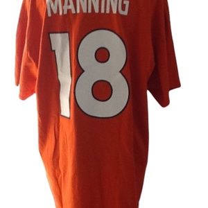 Pre-Owned NFL Team Apparel Denver Broncos Football men’s short sleeve crew neck t-shirt with 18 and Broncos logos on front and MANNING 18 on back color is orange made of 100% cotton size XL approx. measurements armpit to armpit 24” collar to bottom of shirt 29.5”