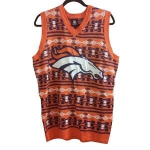 The product is a men's medium sweater vest featuring the Denver Broncos team apparel with an Aztec print design. This V-neck vest is made of acrylic material and showcases the team's colors in a multicolor pattern. The NFL Apparel brand ensures high-quality and authentic team spirit, making it a stylish and comfortable choice for any football fan looking to show their support.