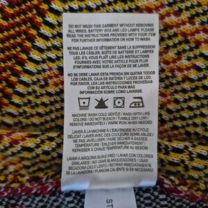 Official NFL Team Apparel Mens L Arizona Cardinals Light Up Long Sleeve Sweater Red White Black. Lights flash on the front "Touchdown" knitted area in the colors of red, green and blue (see video). On/off switch is housed on the inside side of the sweater. Lights can be removed for washing by accessing the strand of lights from the inside front of sweater under white fabric which is stick and peel away. Remove the small plastic round on the front of each of the light bulbs from the outside of the sweater which will allow the lights to be pulled out from the underneath. Really and nice sweater!