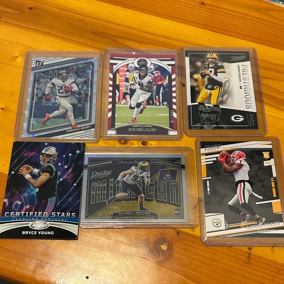 Set of NFL trading cards. Features various players. Vibrant designs and team logos.
